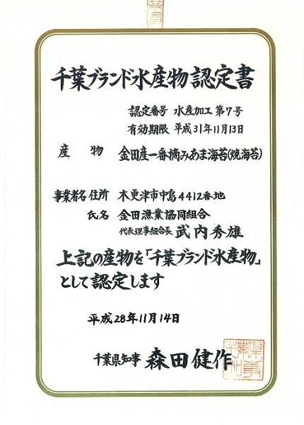千葉ブランド水産物 認定「金田産一番摘みあま海苔(焼海苔)」「金田産焼ばら乾海苔」